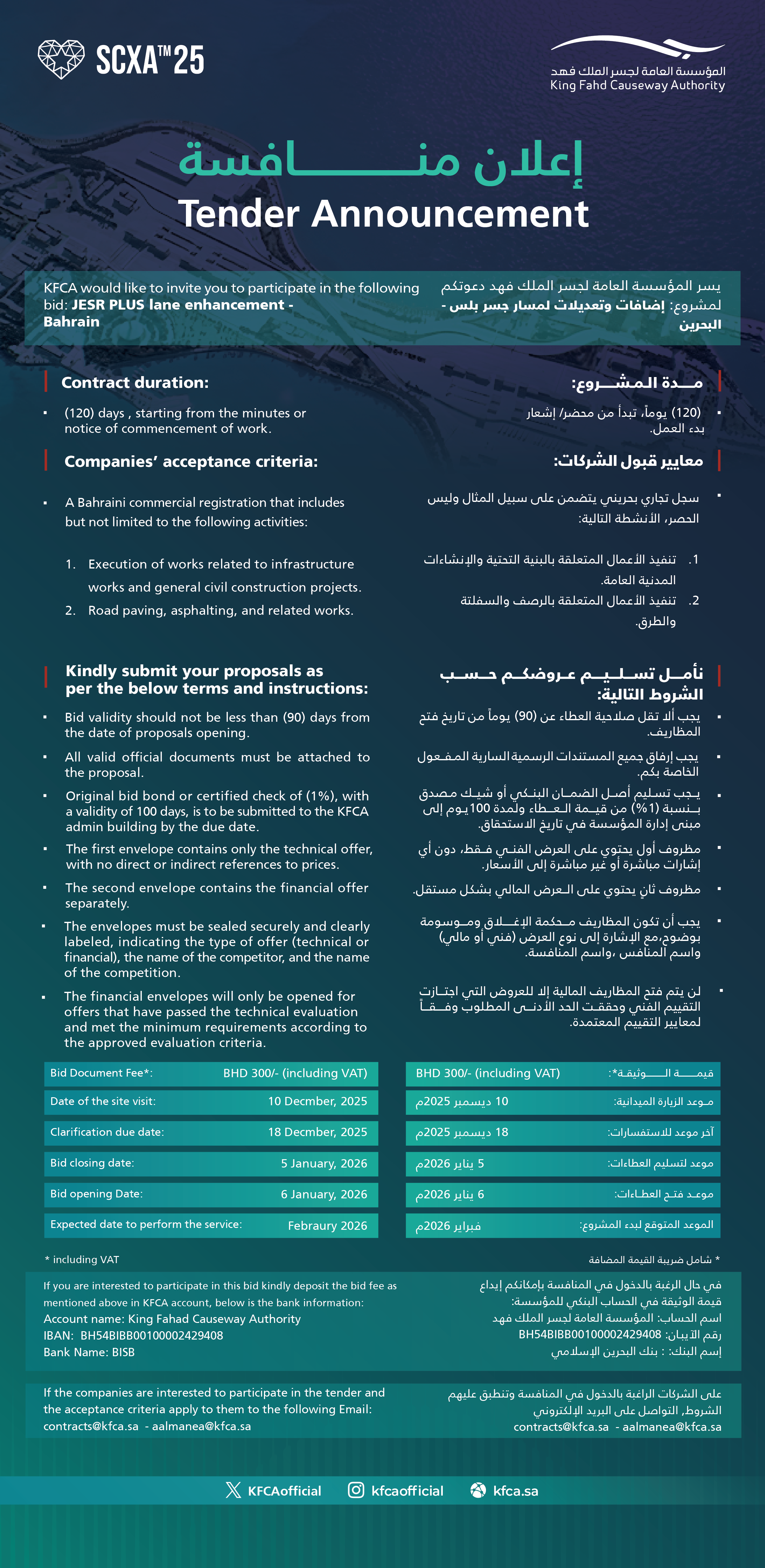 تدعو المؤسسة العامة لجسر الملك فهد الشركات المؤهلة للمشاركة في مناقصة إضافات وتعديلات لمسار جسر بلس.