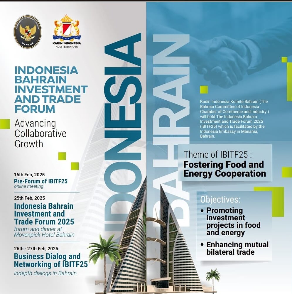 Bahrain Investment & Trade Forum (IBITF) “Fostering Food and Energy Cooperation”, IBITF focuses on promoting investment projects in food and energy sectors and enhancing mutual bilateral trade, with objectives in protein sources (chicken meat & eggs), new renewable energy (micro-hybrid power energy with wind turbine), oil refinery, vehicle tires, and others.