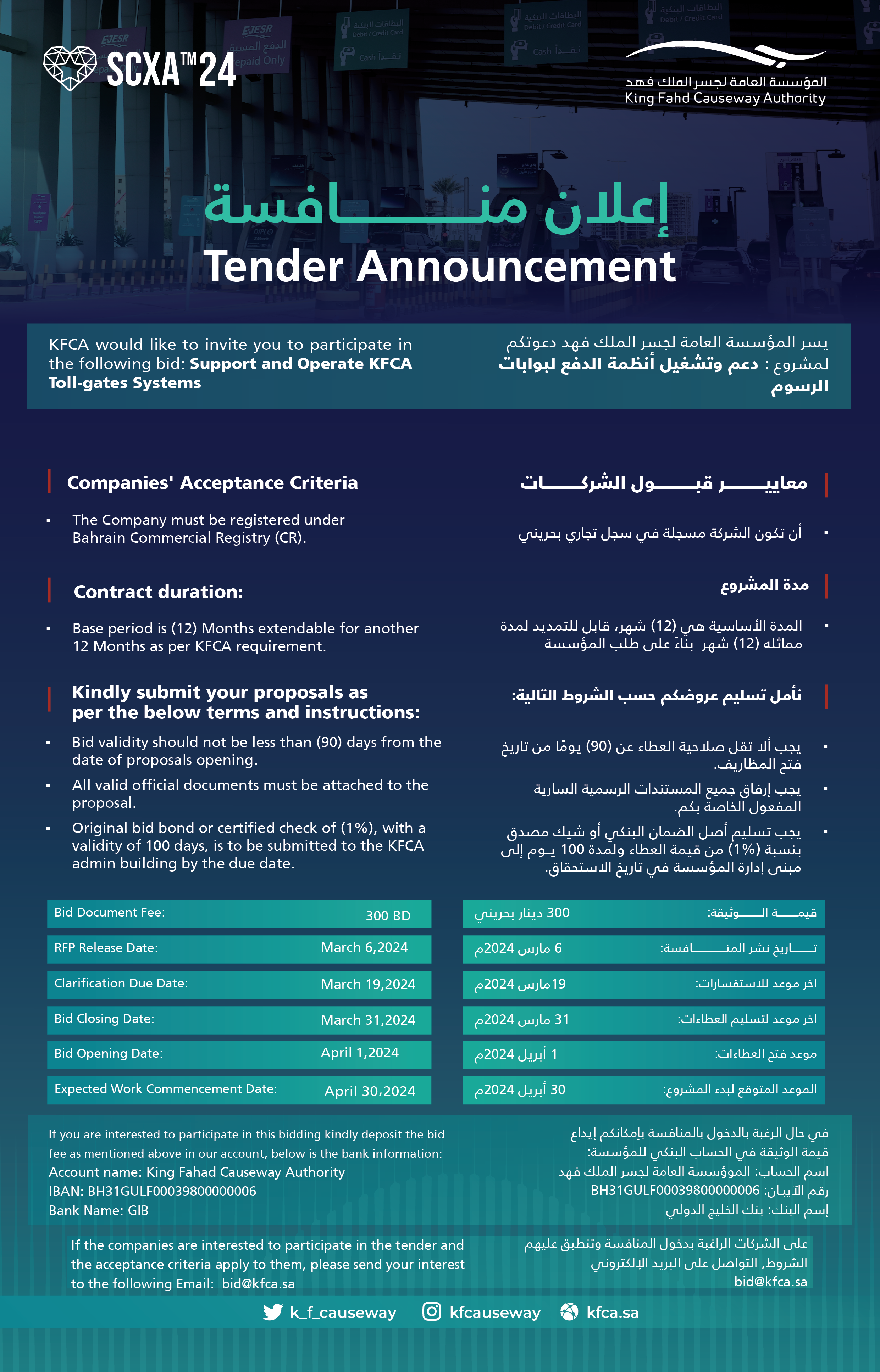 إعلان منافسة: دعم وتشغيل أنظمة الدفع لبوابات الرسوم