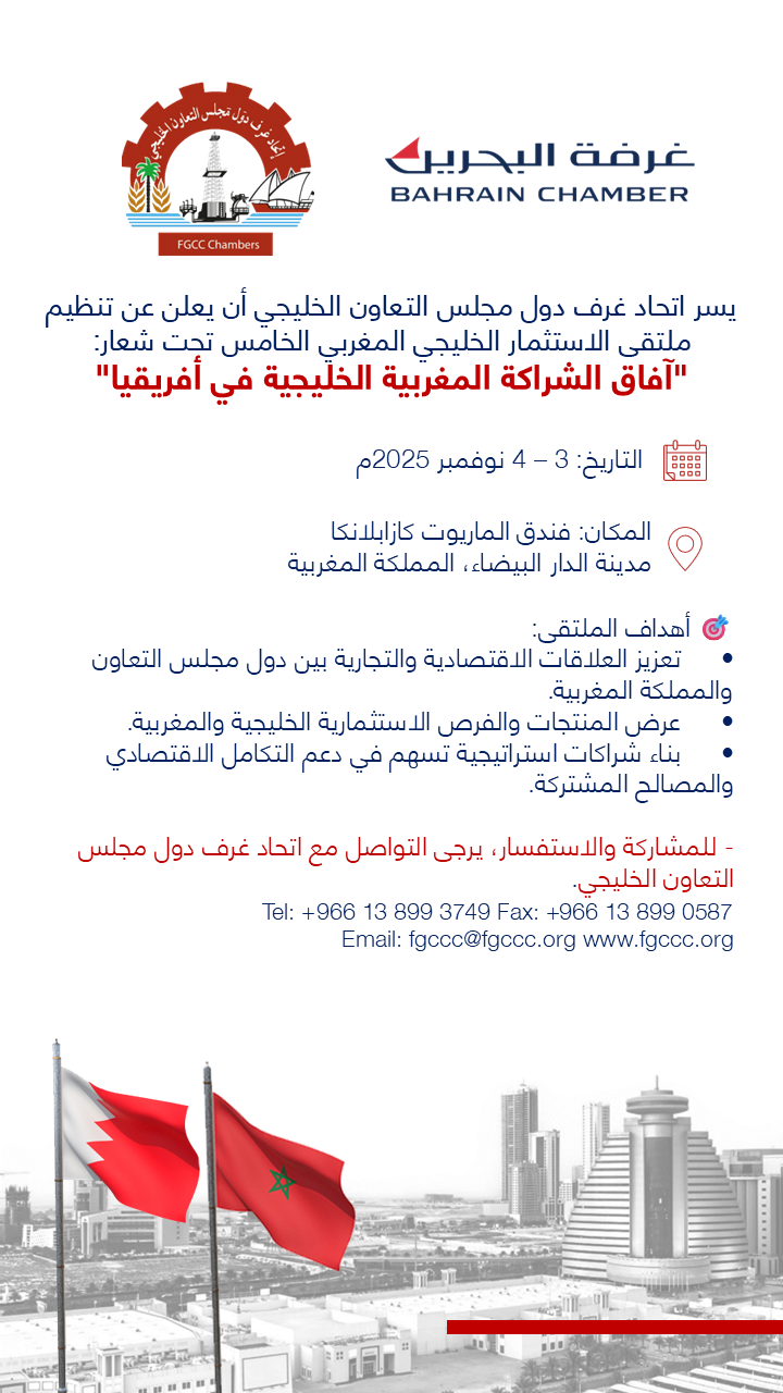 يسر اتحاد غرف دول مجلس التعاون الخليجي أن يعلن عن تنظيم الملتقى الخامس للاستثمار الخليجي المغربي تحت شعار: "آفاق الشراكة المغربية الخليجية في أفريقيا"