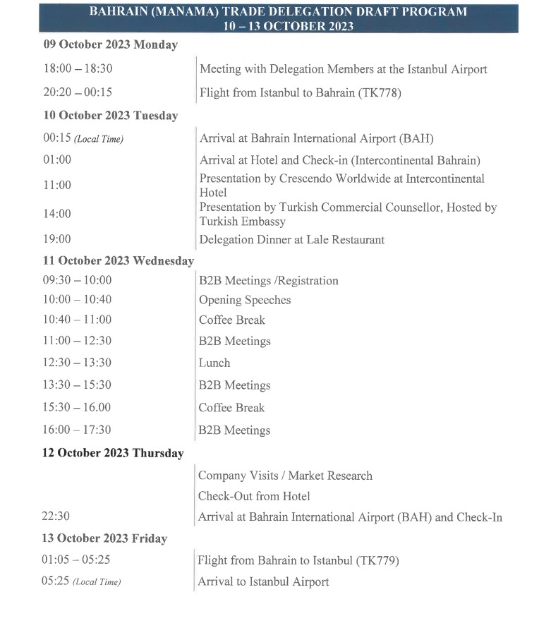 بالتنسيق مع وزارة التجارة في جمهورية تركيا وتحت تنظيم جمعية المصدرين الأتراك وجمعيات المصدرين في وسط الأناضول ، سيتم عقد لقاءات الثنائية مع أصحاب الأعمال من الشركات التركية ، و ستقعد اللقاءات في 11 أكتوبر 2023 يوم الأربعاء.